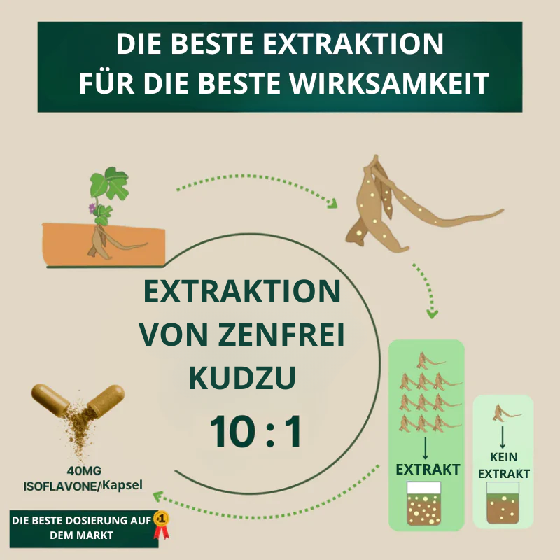 Wichtig zu wissen: Stärkere Nebenwirkungen (Fieber, Depression usw.) wurden ausschließlich bei isoliertem Puerarin in Injektionsform beobachtet – nicht beim vollständigen Kudzu, wie es in Zenfrei verwendet wird.